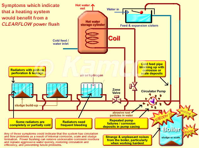 From the very first day that your central heating is commissioned, its efficiency starts to drop. Within a few months a system can lose 10% of its efficiency. Sludge is created due to the chemical reaction that takes place when copper pipe is exposed to hot water. This circulates around the central heating system and eventually settles in the radiators. This sludge seriously affects the performance of the system and can in many cases lead to boiler failure and expensive repairs.